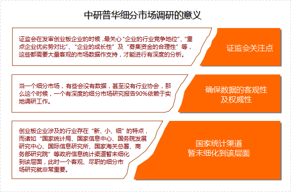 创业板企业涉及的行业存在“新、小、细”的特点,而诸如“国家统计局、国家信息中心、国务院发展研究中心、国际信息研究所、国家海关总署、商务部研究院”等政府信息统计渠道暂未细化到该层面,此时一个客观、尽职的细分市场研究就非常重要。