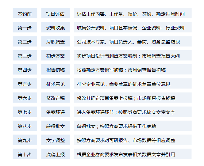 市场研究报告大纲经与企业券商充分沟通后确定;主要解决市场容量历史数据及预测分析、竞争对手研究、企业行业地位与市场份额、行业技术水平、行业特征、行业影响因素等招股书“业务与技术”部分对行业及市场数据的素材需求。